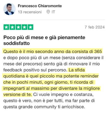 365 è un corso unico nel suo genere: unico nei suoi contenuti, unico nella metodologia proposta e unico anche negli strumenti che mettiamo a disposizione dei nostri corsisti.