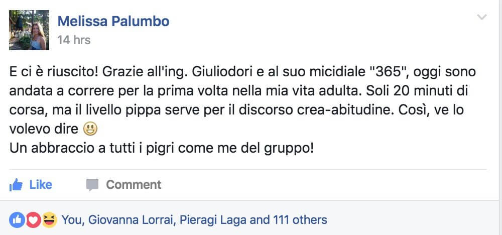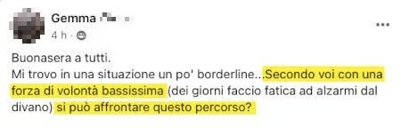 E sì, c’è un gruppo di gente come te che ogni giorno tenta di fare un passo verso i suoi obiettivi, e questo per molti può essere di sostegno.