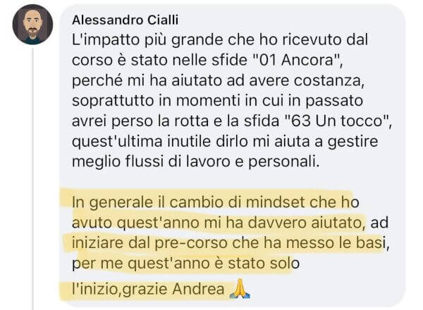 E però dopo un anno, non facendo tutte le sfide o facendole in ritardo, non essendo perfetto nell’esecuzione degli output e raggiungendo solo 2 #mantra su 4, quando hanno riaperto le iscrizioni io ero già davanti al PC in attesa della mail di Andrea.